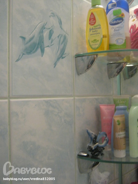 Как-то так.... хотела же плитку заменить.... на темную..... но сейчас понимаю. что а)было бы темно, б)дельфины "заиграли" в новом интерьере по-новому.....