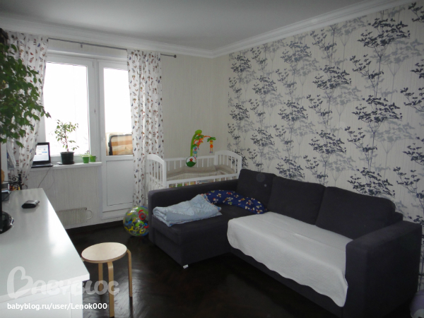 Как многие уже написали, то нужно поменть шторы. Сделайте их однотонные в цвет дивана. Тюль обязательно. На диван яркие акценты в виде подушек, красные, зеленые, чтобы с детскими шторами завязать. На пол светлый ковер. Дерево на пол поставте, уберите эту подставку. На стену, где ТВ, можно повесить фотографии.