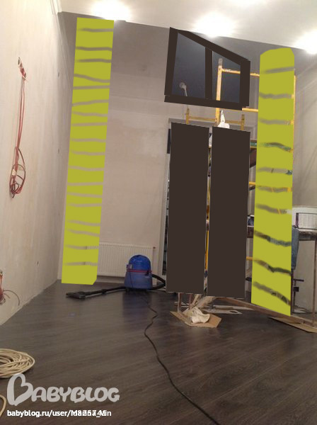 Не вешать, увы, не получится...( слева еще будет лестница на второй ет аж, и там спальня... А напротив дом, все через окошко видно будет)))