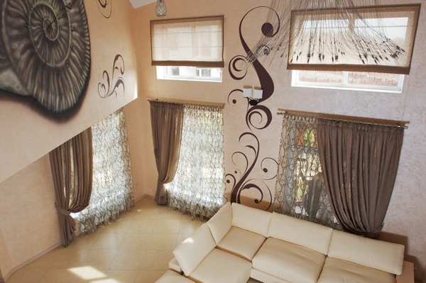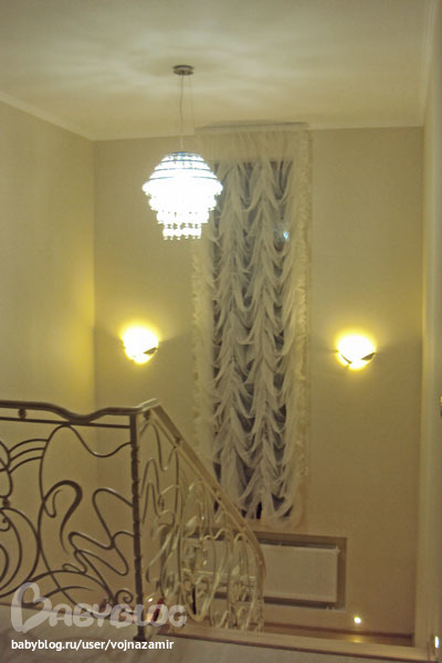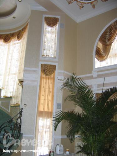 посовеуйте с оформлением вот такого вот необычного двойного окошка.высота-5метров.верхнее маленькое окно под скосом(соответсвенно и потолок косой,на фото может плохо видно).нужно срочно что то покупать,а я не могу определится...