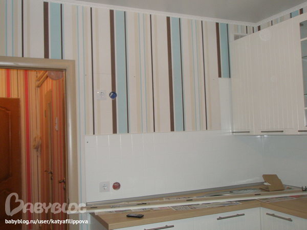 нет, не деревянная. Она дешевле - это раз, за ней проще ухаживать - это два) Когда поставили, меня стали смущать эти бороздочки. Но не буду раньше времени расстраиваться, может все ок.будет) Я думала сначала сделать под грецкий орех (темную), она нам под темные полосы и цветы на обоях подходила, но потом как-то передумала, что каждая крошка после раннего завтрака мужа раздражать будет, чтобы с утра по раньше не портить себе настроение, решила эту брать.