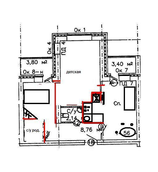 если стена между кухней и комнатой 18 м2 несущая и если в доме не газ, на месте старой кухни ваша с пальня и личный ваш с/у, в месте где был проход в комнату 18,6, располагаете мокрые (мойку, в частности) зоны, т.к. запрещено мокрые зоны располагать над сухими, и из комнаты 14,5 получается кухня, где спокойно можно поставить диван и стол. после такой перепланировки получится отдельная спальня для вас, большая детская( если дети имеются), или же комната для вас, а бывшая кухня пока как кабинет, на перспективу детская.