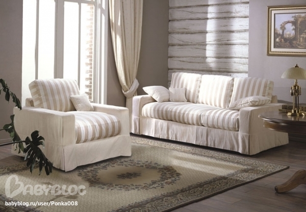 У нас в гостиной-детской диван и кресло как на картинке, только и боковые части полосатые. Ткань - хлопок. Все чехловое, т.е. съемное для стирки. В доме один маленький шилопоп, собака и две (!!!) не гладкошерстные кошки. Стираем один раз в месяц все + стрижем катышкобрилкой!!! За 6 лет диван не утратил былой привлекательности. Не променяю его не за что на более темные!!! =))) P.S. Я вообще в принципе не понимаю, чем светлый диван отличается от темного? И за тем, и за другим нужен уход. =)))))))