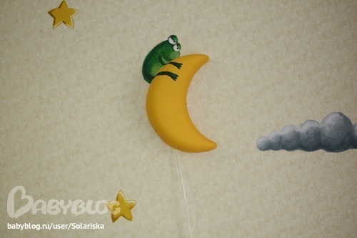 Это барашек Рассел из нежно любимой моим сыном книжки. Над кроватью - тема ночи, звезд... ну, понятно в общем. светильник в виде луны из Икея, а на светильнике нарисован спящий друг барашка - уже не помню как его там...