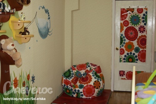 Ну и как вы могли заметить, из икеи я прихватила большой кусок ткани Фредерика: из него пошиты занавески, обита дверь(она нам досталась также от прежних хозяев в плачевном состоянии) и пошит чехол для кресла-подушки. цветы под деревом тоже из этой же темы (надеюсь, не перебор)