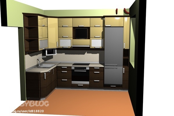 мдя, со шкафчиками намудрил "дизайнер"...и телевизор зачем там?..куда вытяжка будет воздух гнать?..я бы холодильник, если у стены нет батареи, передвинула вправо, чтобы рабочая поверхность была нормальной (эти шкафчики узкие у окна непонтые совсем)