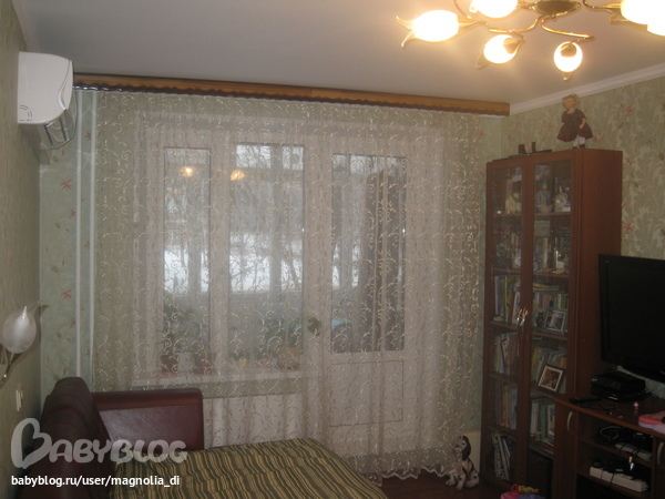 Кстати, у меня левая стена с цветами, правая без. Тюль не снежно белая, легкий пастельный оттенок. Из-за балкона решила ее разрезать (то есть не цельная, а две шторы), теперь думаю, зря )