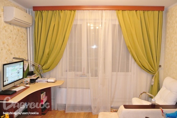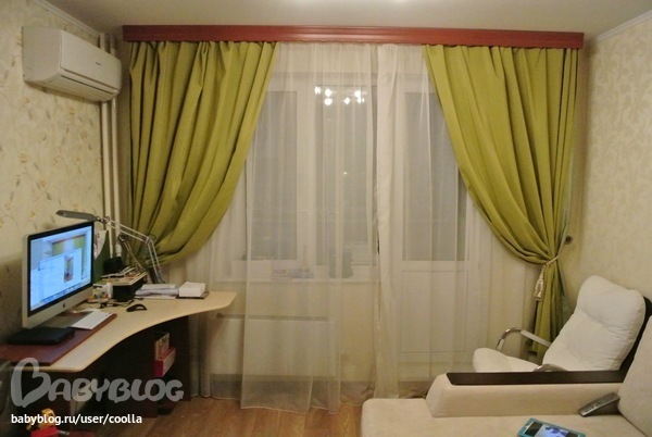 В общем я рассмотрела оттенки цвета, используемого в листьях цветов обоев и купила две шторы (недорого в леруа мерлен и костораме, плюс там же крепления), одна светло зеленая (атласная), другая темно зеленая. Отдала их партнихе, она их сшила, получилась темная в комнату, атласная к окну. Штора плотная - свет не пропускает, выглядит как тяжелая.. я люблю тот эффект.