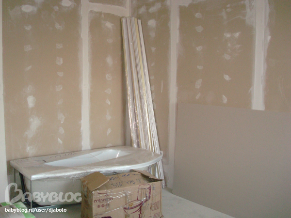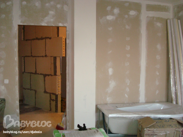 Идем в зал. Сейчас у нас там склад всех нужностей для ремонта...плитка, ванна, унитаз расположены пока в зале.