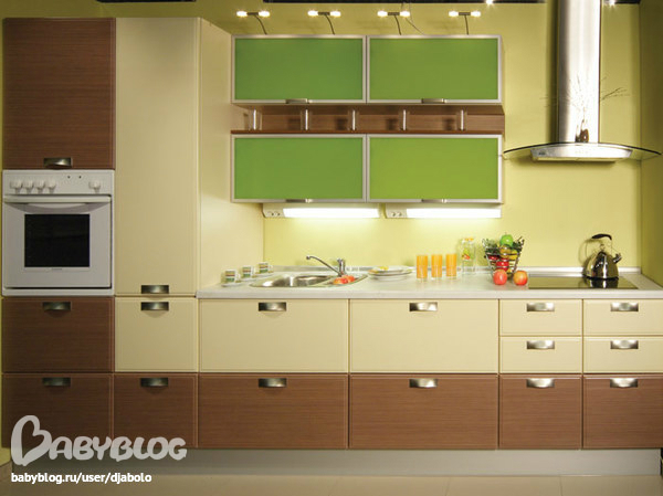Где салатовые вставки, там матовое стекло такого цвета, так что не сильно ярко. Два больших шкафа мы поменяем местами и поставить с другой стороны. Наполнение максимальное и очень хорошее.