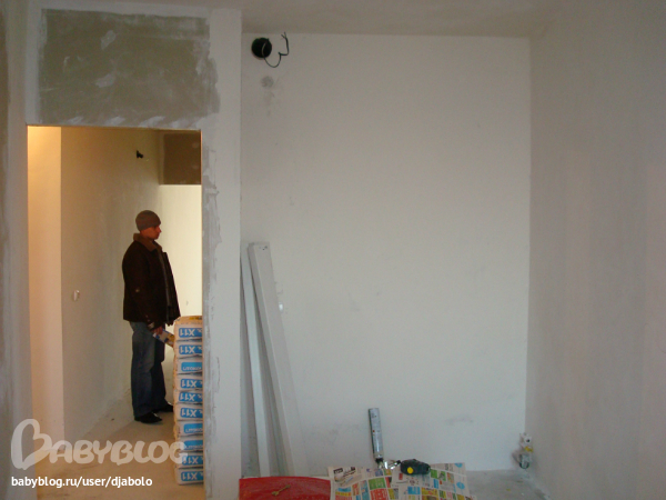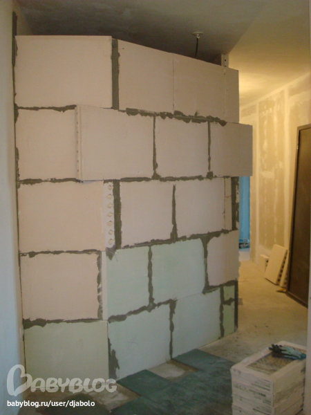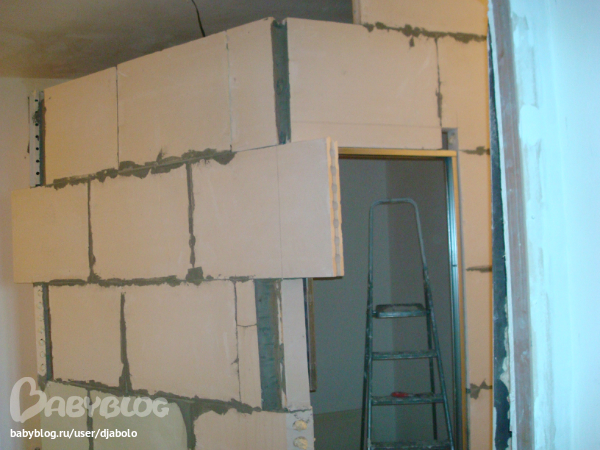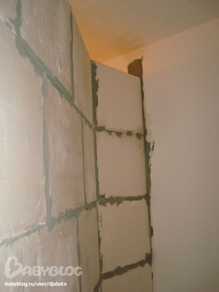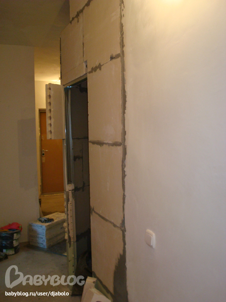 В коридоре, где расширение я сразу решила сделать гардеробную комнату. Посоветовшись с нашим прорабом-рабочим (он один делает весь ремонт), решили гардеробную возводить из пазогребневых плит. Долго думали какого размера сделать, чтоб и вместительность была максимальной и удобно было ходить в коридоре. Итог получился очень не стандартная гардеробная со скошеным углом.