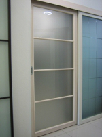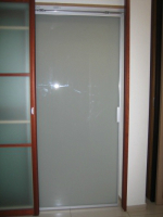 Дверь в гардеробную будет откатная, ее мы заказали отдельно. Просто матовое стекло в алюминевом профиле.