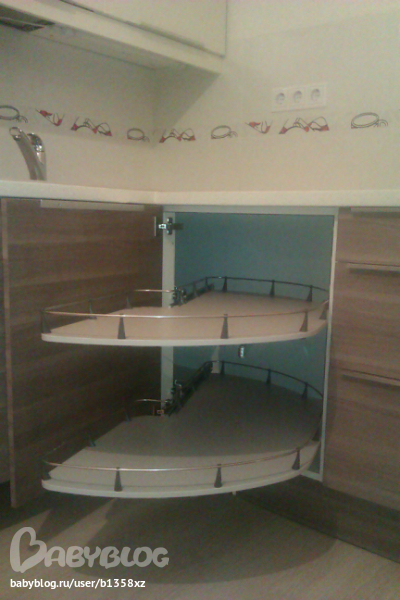 мойка врезалась в 2 ящика, сама мойка врезана в 60 ящик по той стене, где плита, а крыло в ящик 120 см, который с каруселью.