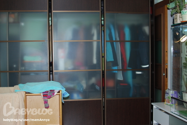 В комнате, где выемка, у них гардеробная. Т.е. за раздвижными зеркальными дверями вход в шкаф, где много полок и зеркало. Туда можно зайти и там же переодеться очень удобная вещь, туда можно убрать все, начиная от одежды и заканчивая пылесосом и гладильной. доской. Справа от гардеробной стоит детская кроватка, затем комод, а над комодом висит плазма. По левой стене угловлой диван. Дополнительных шкафов и стенок в зале не требуется, т.к. все шмотье умещается в гардеробную.