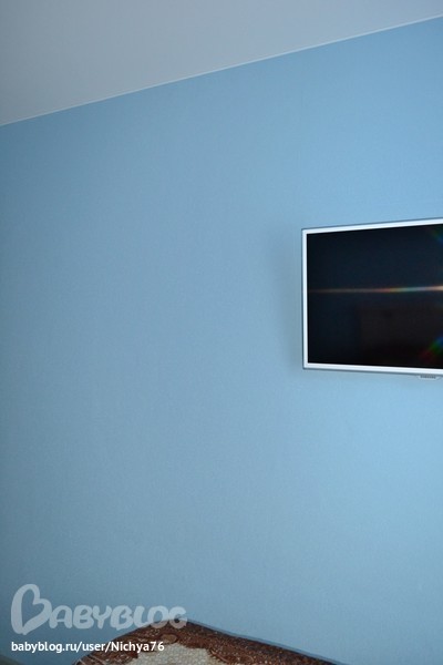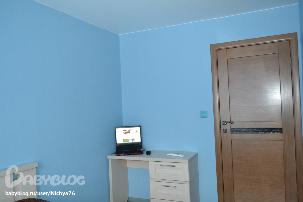 Брр какая "холодная" комната получилась. Голубого мне кажется на стенах достаточно. Сейчас модно с голубым коричневый, беж, белый..