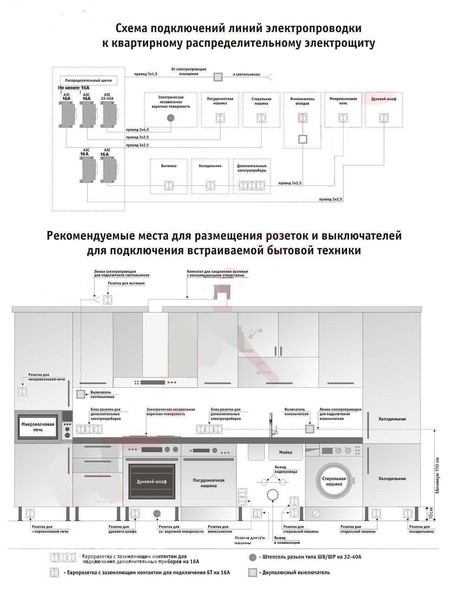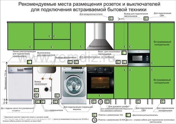 Мы когда кухню в икее планировали, нам сказали в цоколе делать все розетки, ну и над столешницей, в зоне рабочей поверхности.