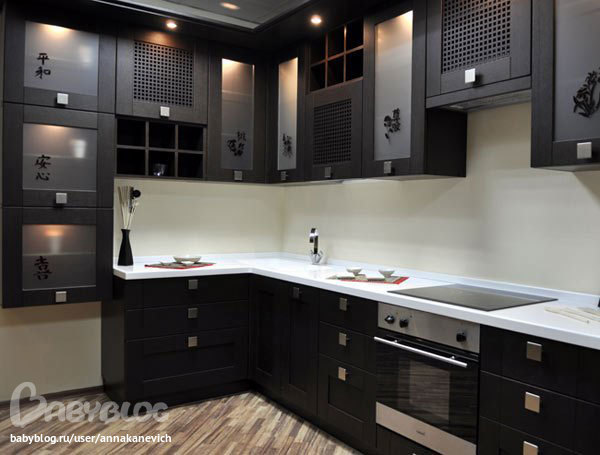 Или наоборот, если тёмная мебель, то светлая столешница с фартуком
