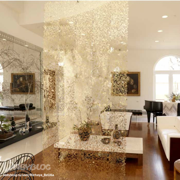 причом я вот недавно где-то полным полно видела подборку фоток первого варианта - кругами, ромбами, красного цвета, всякие вот такие "шторки" из пластика или некого декоративного материала были...
