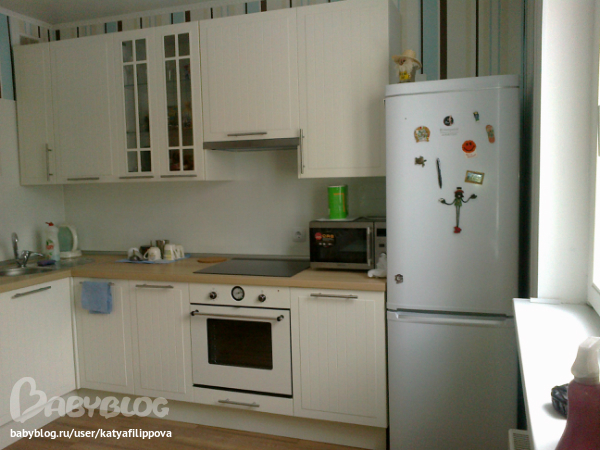 и вообще мне кажется, что у нас кухни по размеру одинакове)) квадратная она, сама кухня также, мойка и дверь. Вообщем всё как у вас)) Только холодильник будет за дверью