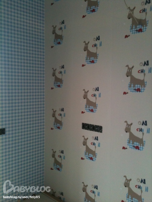 на одной стене компаньон этих обоев темно-синие собачки с красными божьми коровками(эта стена предназначена для стеллажа с игрушками, столика для рисования и игр).Мебель в комнате вся белая, хочу еще купить такой ночник на тумбочку