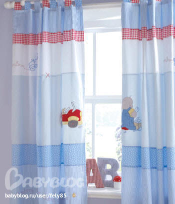 Окно-дверь на балкон из детской двустворчатое до пола, но рамы не белые, а дерево темный дуб.Теперь соответственно вопрос который я не могу решить.Какие выбрать занавески и ковер? Понимаю, что надо контрастное что-то к пастельно-голубому, но очень пестрое не хочется.Так как на противоположной стене красные божьи коровки предполагаю контрастный цвет красный… как вариант красный ковер.Что касается штор мне нравятся такие варианты