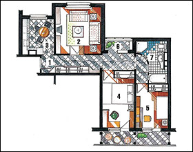 Вариант №1 (был у нас основным) Зашить проем на кухню из холла, вместо него сделать встроенный шкаф на глубину вентиляционнго короба на кухне, и прорубить его из гостиной. Только на этом плане еще и гостиная уменьшена, мы так делать не собирались.
