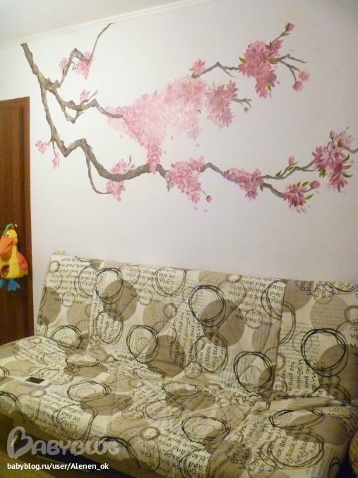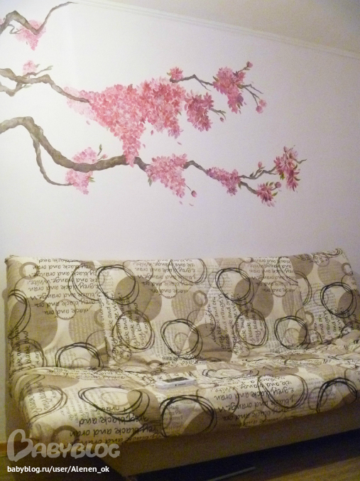 Очень красиво! И можно постепенно дорисовывать и дорисовывать, когда приходит вдохновение, пока не получится такая красивая фреска на всю стену! У меня фотка медленно открывалась, сначало открыла дерево и я почему-то подумала, что диван будет в малиновых тонах как цветочки на ветке, ан нет:).