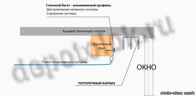 Либо делается короб из гипсокартона и к нему уже устанавливается натяжной потолок,либо устанавливается деревянный брус под натяжной потолок и багет крепят к брусу вот так: