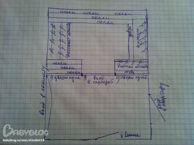 пока ни чего не сделала, но определилась одно полотно стационарное ( не будет двигаться, по левому краю) , и 3 полотна двери купе, 2 для входа в гардеробную и 1 для открытия ниши для верхней одежды( правый угол), как буду делать проект выложу)))