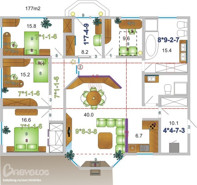 я б две маленьких спальни обьединила в одну и сделала игровую для детей и поставила бы туда диван гости могли бы там спать , потому что если вы планируете много детей то в ваших 15 м спальнях им негде будет играть , одни кровати будут .. я напрмер своей дочери в доме планирую комнату 25 метров...плюс считайте что дети пока маленькие . а через 15 лет они будут взрослые и как они например вдвоем будут жить в 15 м комнате? им нужны будут рабочие столы , шкафы кровати взрослые...в общем феншуй феншуем , а удобство удобством..у вас все слишком маленькое.У меня сейчас дом строится 10 на 16 . но со встроеным гаражем, но у нас второй этаж будет.. а первый этаж кухня-столовая-гостиная....Плюс хотела у вас спросить вы участок уже купили?Потому что я до покупки участка тоже планировала дом . а в итоге он к нам на участок не встал и пришлось строить совсем другой...