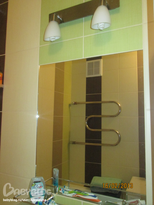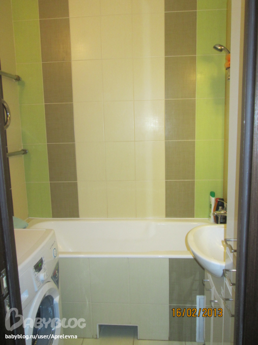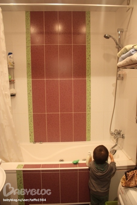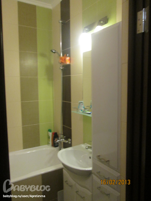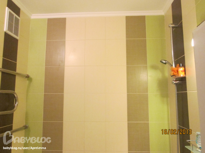хоть у нас с вами и разные плитки в ванне, но я когда увидела сперва подумала что это наша... Начиная от того как мебель расставлена заканчивая тем что у нас по центру так белым выложено по краям салатовым и дальше тоже все на зоны поделено
