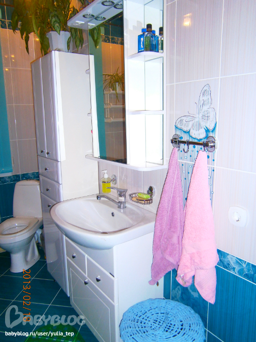 Интерьерное решение ванной комнатыДавно собираюсь показать наш ремонт, да все некогда. Вот сегодня решила - пора, пока не пришлось его снова делать))). Ванная 2,50х3,50. Делали больше двух месяцев, но теперь я довольна. Есть, конечно, еще недоделки - надо батарею внизу покрасить и еще на потолок несколько плиток положить. Пока его делали лопнуло три зеркала, надеюсь на счастье. Но основная работа сделана! Итак..