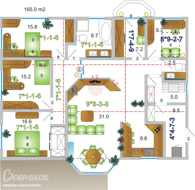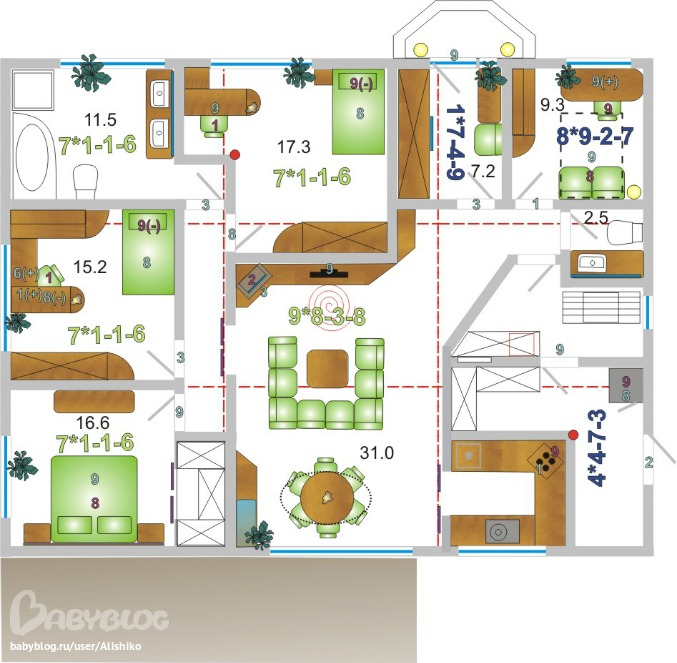 вот мне интересно стало , вы планируете по феншую отталкиваясь от входа дома или от севера-юга? сетку как рисуете?и смотрите что бы у вас в зоне любви туалета не образовалось ... в зоне богатства сортир тоже плохо ///
