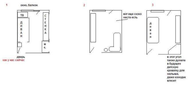 У сестренки мебель как у вас на плане, только кроватка стоит гдк ТВ, комод напротив, рядом со стенкой. Где у вас шкаф, во всю стену шкаф-купе из Икеи, огромный+компьютерный стол. Только дверь открывается по стене слева.