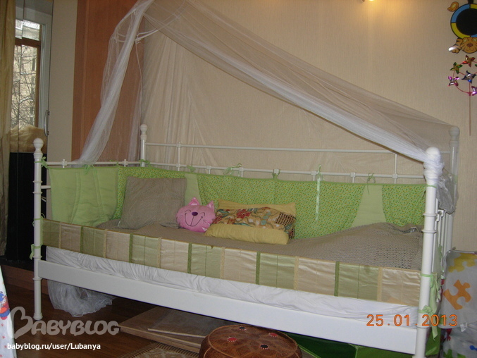 Если кому интересно, сам бортик сделать очень просто - в нашем случае это паркетная доска на 5 см больше кровати (подойдет и простая, мы использовали. что было под рукой), уплотнитель (у нас ватин, но подойдет и синтепон и паролон), остаток ткани от шторы и 4 веревочки. Просто обернули доску уплотнителем и тканью, закрепили при помощи мебельного степлера (можно просто гвоздиками забить), на каждом конце с внешней и внутренней стороны пришила веречоки, привязали к боковинам кровати, бортик по сути стоит на краю матраца. Еще сшила потом подушечки из остатков шторной ткани, но они на фото не попали.