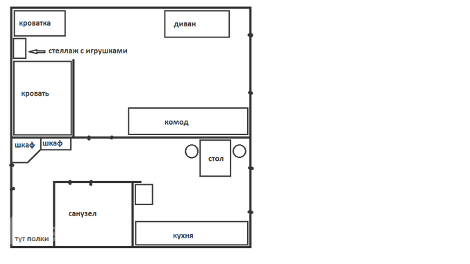 Мы тоже в однушке вчетвером ))) У нас с мужем кровать (не люблю на диванах спать), у старшей диван (временный, скоро обычную кровать поставим) и мы его никогда не складываем, младшая в детской кроватке спит. У стены рядом с кроватью старшей стоит стеллаж с игрушками и книжками. В углу маленький компьютерный стол, но мы за ним не сидим никогда, а с ноутом на кухне размещаемся. Еще два шкафа небольших - один мой с одеждой и один книжный. И два комодика - побольше для вещей старшей, поменьше -для мелкой. Это все в комнате. А на кухне столик и стульчик рабочий для старшей (рисовать-лепить), стул для кормления младшей, стиралка, обеденный стол и сам кухонный гарнитур. Еще в коридоре большой шкаф для одежды. Вото как-то так разместились )))