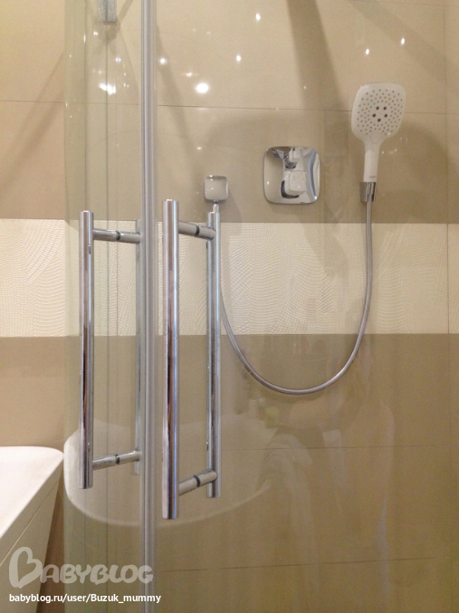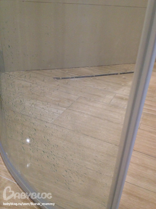 Кстати про воду: на стеклянне дверцы вода, конечно, попадает, но в основном снизу, в виде брызг, капли высыхают и я не скажу, что сильно бросаются в глаза следы от высохших капелек, тем более не на уровне глаз, а гораздо ниже, в принципе можно после себя каждый раз убрать воду специальной щеточкой - это реально займет секунд 30, но после детей не всегда есть возможность/желание - так как надо скорее всех по кроватям разложить)) раз в неделю помыть стекла вполне достаточно, вид все равно достаточно аккуратный всю неделю. Правда средство найти хорошее надо, я пока в поиске))