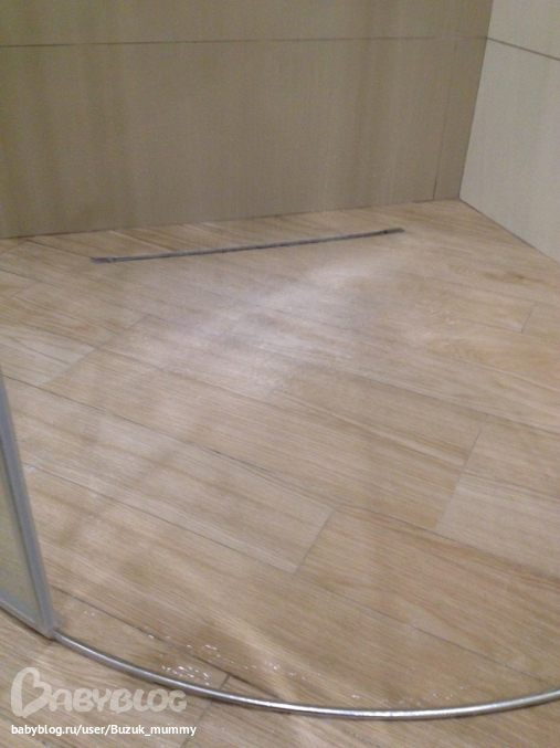 Пол в ванной единый и ровный, нет ни одного порожка, ни при входе, ни в душевой, сделана полная гидроизоляция всей комнаты. Плитку выбрали длинную по размеру, из-за этого ее было очень сложно наклонять, пришлось резать ее именно в углу, где душевая на более короткие. Наклон внешне незаметен, но вода знает свое дело :) Какие тут нюансы.. естественно в швах плитки вода остается и тонкий слой на плитке остается, далее либо смириться и ждать пока высохнет сама (так как в ванной теплый пол, то высыхает быстро), либо специальной щеточкой для стекол убрать воду.