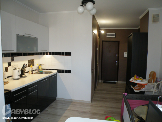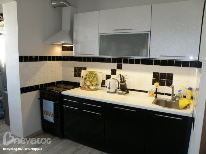 Наша кухня. Увеличили за счет балкона. Планировали черно-белую,а на противоположной стене, во всю стену фотообои ночной Нью-Йорк или Париж,но пока так и не сделали,на стене Эли рисует бананами,яблоками и тд))) теперь в планах сделать лучше калаж из наших фотографий, тоже в черно-булом цвете.