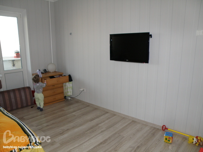 По другую сторону еще ничего не сделаи,только телек повесили))) Комод старющий- временный.