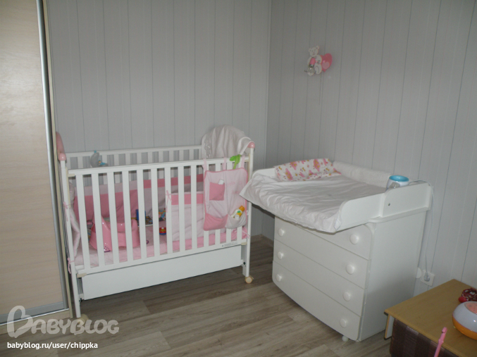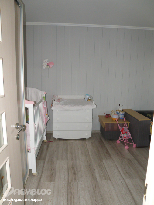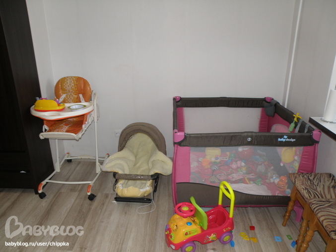 Диван планирует по этой стене поставить,калаж над ним. А пока тут Элишкина игровая зона,люлька от коляски в которой она обожает сидеть,манеж и стульчик)