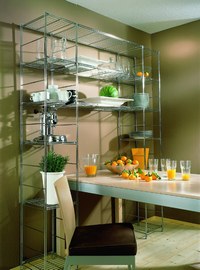 соберите кастрюльчи и ссковородки по принципу матрешки- и все в нижний шкафчик, а крышки куда-нибудь в другое место (у свекрови в столе висит такая железна штука специально под крышки). что-то можете и в духовку положить когда мало мест, то и духовка- шкаф.. ))))) А посуда на стеллажах и на реллингах- никак кухню не укрсят- только ощущение беспорядка создается.