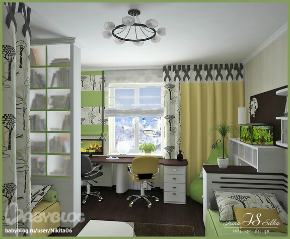 Дело в том, Оль, все нравится: стеллажи, стол длинный для двоих, шторки не будет (шторка для девочки рассчитана, этот проект я нашла в инете и нам по комнате подходил и понравился), и что-то мне в голову стукнуло-хочу мальчишкам синее, голубое. Вообще я возможно выбрала более взрослую комнату, а моим детям 3 и 7 лет, хотела чуть мужественнее сделать комнату)))))