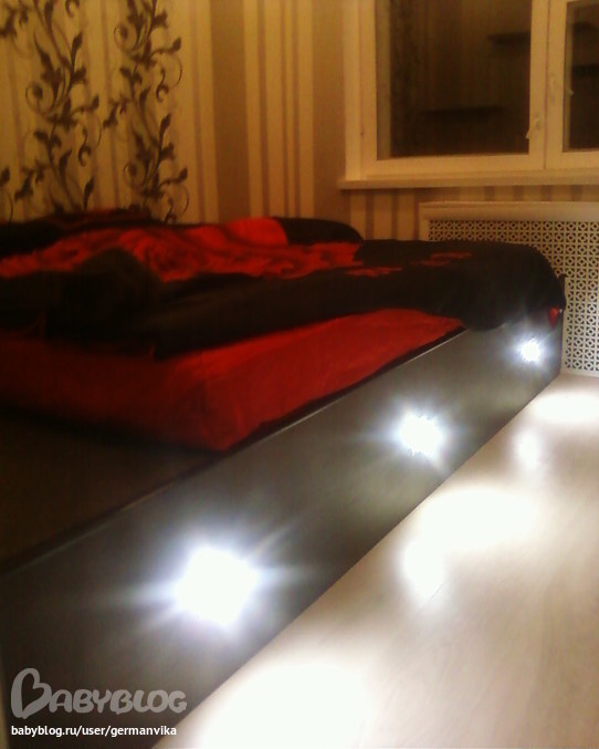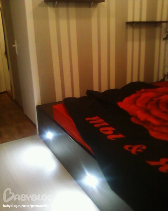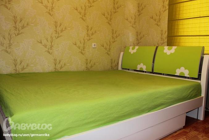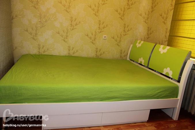 Три года назад заселились в собственную квартиру, была строительная отделка, купили кровать и шторку в спальню, больше ничего не делали. Я загорелась кроватью-подиумом, муж обещал что когда-нибудь сделает...И вот почти готово! Было так: (особо комнату не фотали, поэтому есть только фотографии кровати, но суть понять можно)