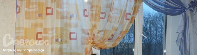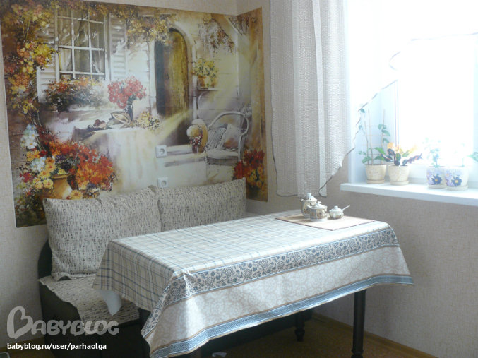 - скатерть и шторы на окно - голубые с каймой серого цвета - в тон кухне