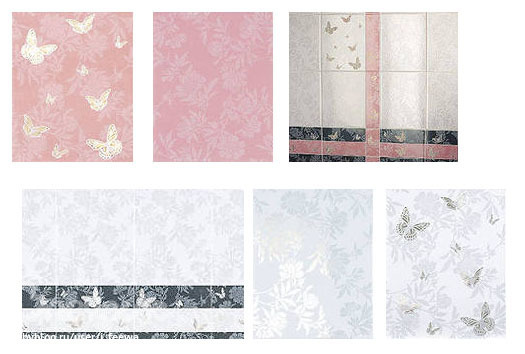 Хочу вот из такой плитки придумать дизайн, основной цвет белый, второй цвет розовый и чуть-чуть черного бордюра с бабочками.