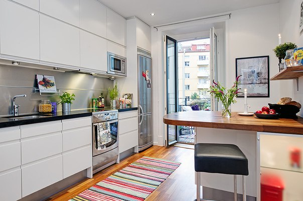 сделать полочки на столбе) для цветов, книг, сувениров, посуды..черно белый круто, но не берите глянец, сильно видна грязь. нужны акценты. например стулья пусть будут ярко зеленые или лиливые, пластмассовые, очень стильно