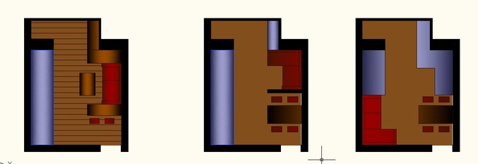 Синим выделенно - кухонный гарнитур, красным - диван и стулья, коричневым - столещница.
