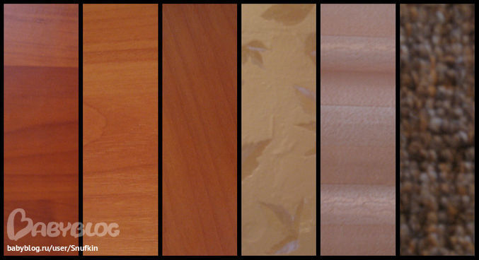 Комната выполнена в теплой гамме (желто-коричнево-деревянные тона). Слева направо: дверь-стол-шкаф-обои-шторы-ковер.