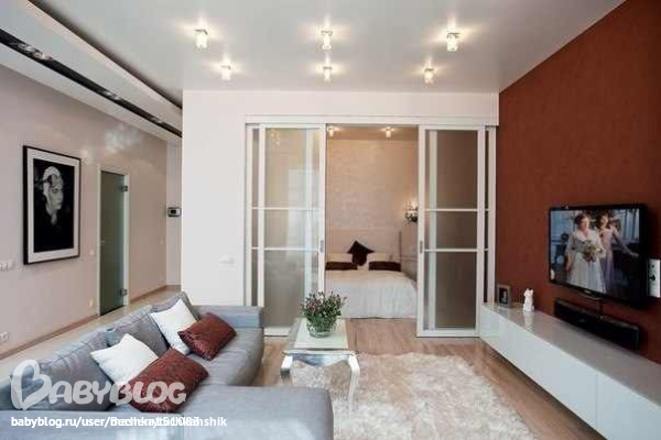 Кабинет уходит на балкон. Где кровать - система раздвижных дверей,кот могут на день оставаться открытыми и при этом комната будет получать естественный свет. В прихожей у вас по идее должно еще место и под шкаф хороший остаться и под пуфик с зеркалом. Ну если не останется места от кровати, то шкаф к туалету унесете. Или в этом закутке, но с естественным освещением сделать детскую спальню, а игрища в основной комнате.Я бы так сделала. Вот картинка с принципом, только у вас красиво получится, т.к. кладовка утоплена